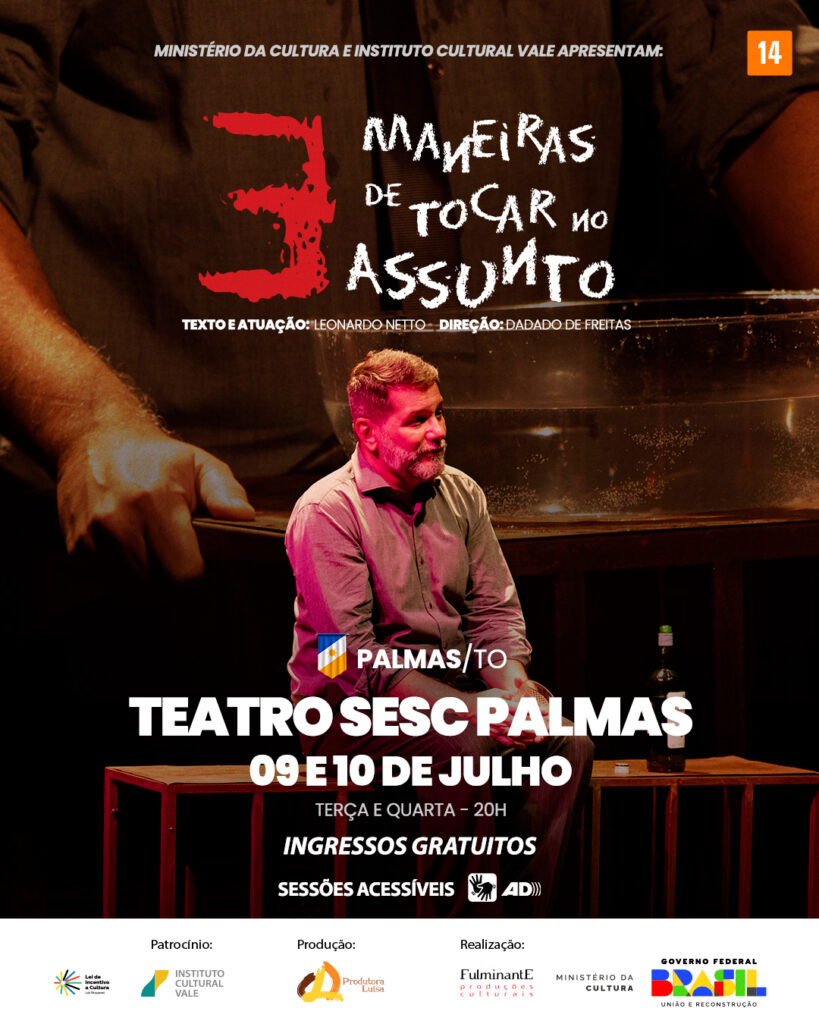 Ministério da Cultura e Instituto Cultural Vale apresentam o espetáculo 3 Maneiras de Tocar no Assunto no Tocantins