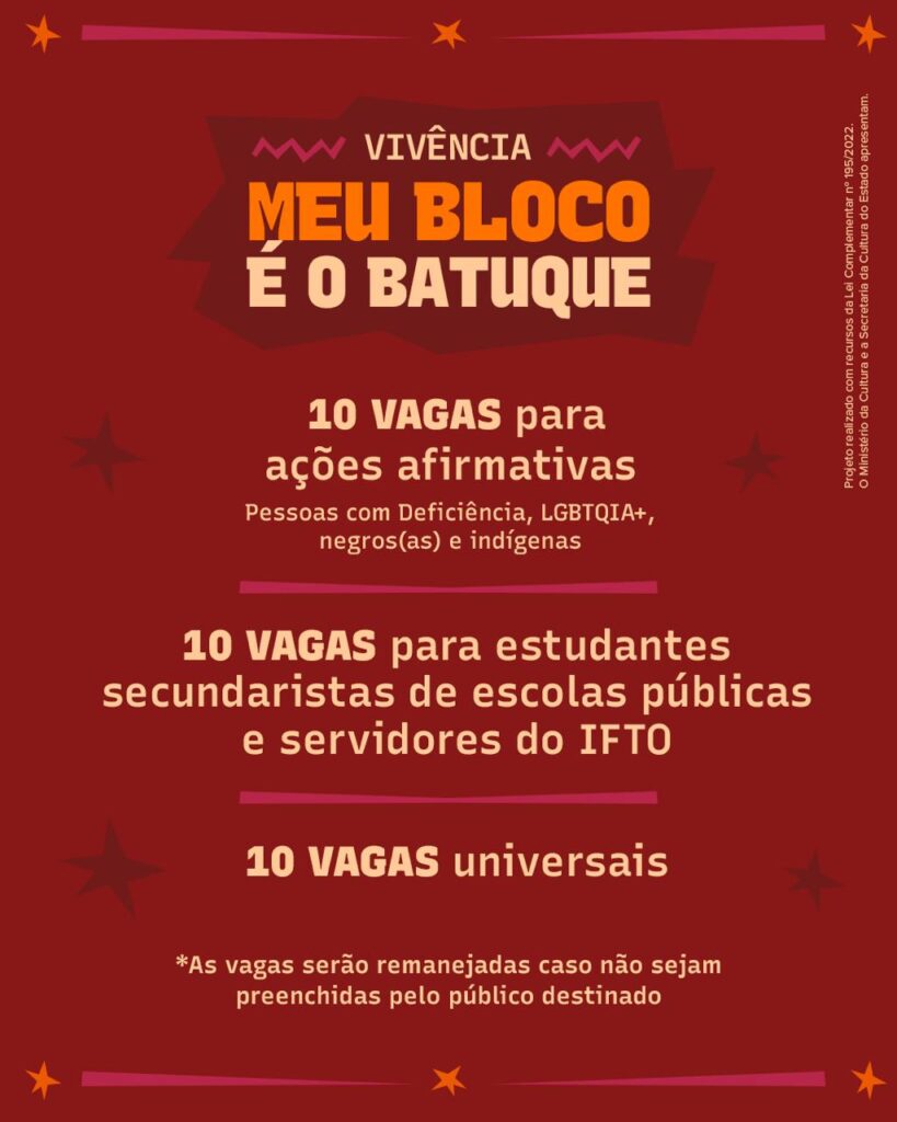 O Coletivo Amo Meu Bloco, em parceria com o Ministério da Cultura e a Secretaria da Cultura do Estado, está com inscrições abertas para a Vivência Meu Bloco é o Batuque, um evento que visa preservar e ampliar o acesso ao patrimônio imaterial do Tocantins. A vivência ocorrerá no próximo dia 15 de maio no […]